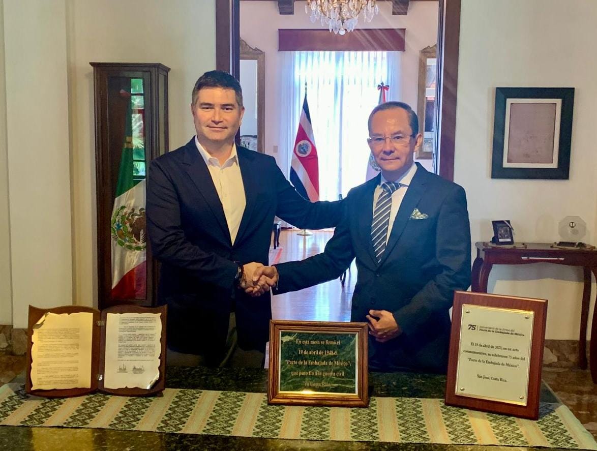 El secretario de Economía y del Trabajo, Luis Pedrero González, sostuvo una reunión con el Embajador de México en Costa Rica, Víctor Manuel Sánchez Colín, con el objetivo de fortalecer los vínculos comerciales y explorar nuevas oportunidades de inversión y cooperación entre ambos países.